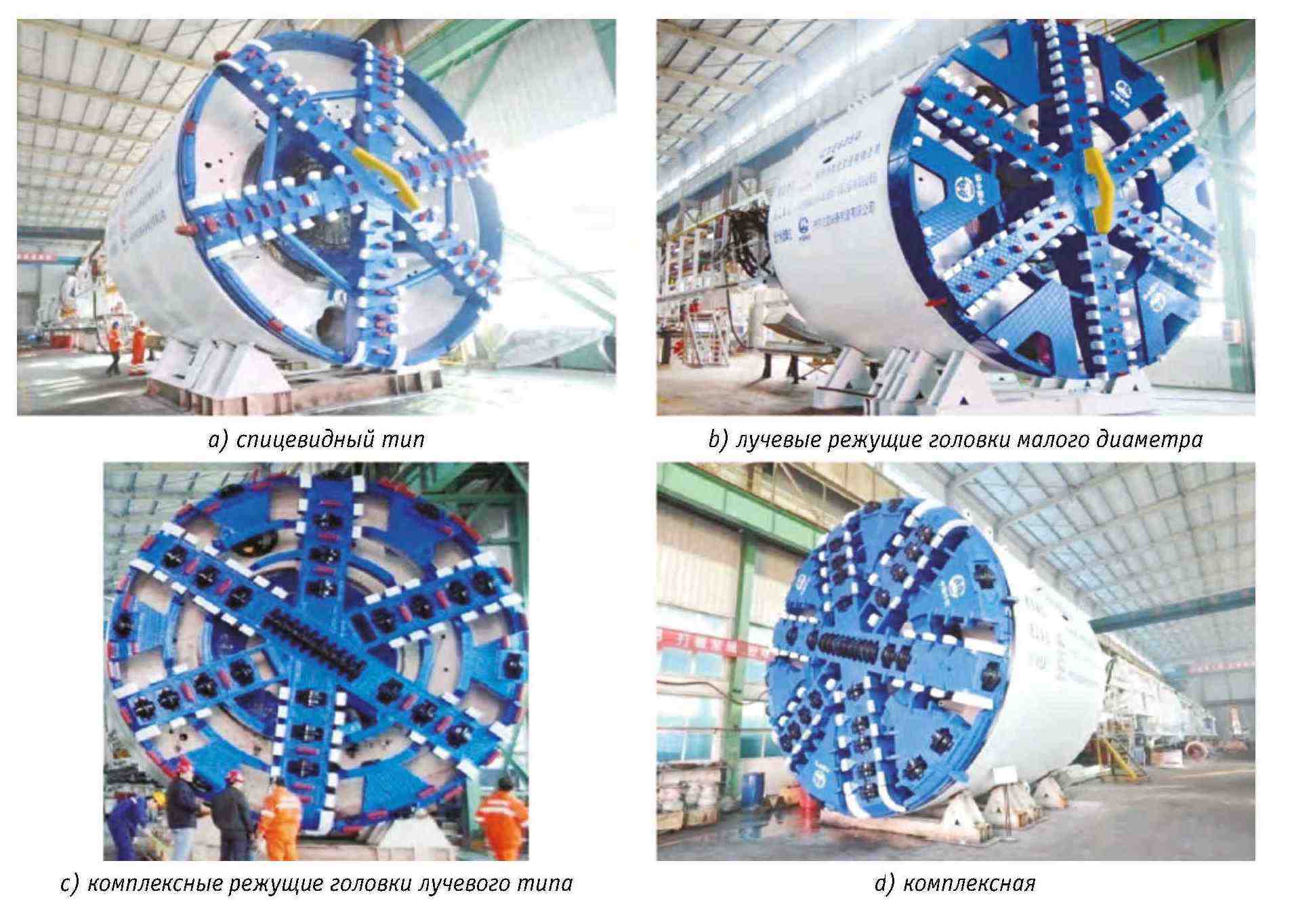 Структура ротора (рабочего органа) и компоновка ножей должны быть четко спроектированы. В песочных, гравийный грунтах и слоях с галькой малой фракции лучше применять режущие головки спицевидного типа (лучевого), как показано на рис. 2-20а. Степень открытости для такого вида режущих головок достаточно большая (70–75%), это удобно для контроля грунтопригруза и это уменьшает износ режущих головкок; расположение режущих головок по уровня, увеличивает размер сплава, чтобы усилить его устойчивость удару. В глинистых грунтах лучше использовать лучевые режущие головки малого диаметра, как показано на рис. 2-20b. В глинистых слоях возможно образование глинистой корки, а режущие головки лучевого типа малого диаметра обладают в центре опорной конструкцией из труб, что помогает в снижении формирования глинистой корки. В слоях с гравием больших фракций лучше использовать комплексные режущие головки лучевого типа, как показано на рис. 2-20с. Износ резцовой головке от таких геологических слоев большой, поскольку гравии большого диаметра непросто промолоть, а лучевые конструкции способствуют уменьшению крутящего момента, большая степень открытости помогает выбросу гравия. Применение вращающихся фрез может сыграть перемалывающую роль (перемалывание вместе с выбросом), одновременно с этим добавляет износоустойчивость режущим головкам. В скальных слоях лучше использовать комплексную резцовую головку, как показано на рис. 2-20d, поскольку она обладает достаточно большой перемалывающей способностью.