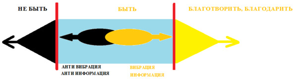 Предположим, что в момент деструктуризации Абсолютного нуля с последующим образованием двух противоположных информаций «быть» и «не быть» одновременно в информационном конфликте возникли вибрация и антивибрация. Первичная Вселенская вибрация"быть» моментально чувственно испытала опасность и отреагировала защитной реакцией Сознания «защитить быть» в противовес на антиинформацию антивибрации «не быть», направленную на «поглотить «быть». Информация «быть», устремленная к состоянию «благотворить», увеличилась в потенциале до «защитить «быть».