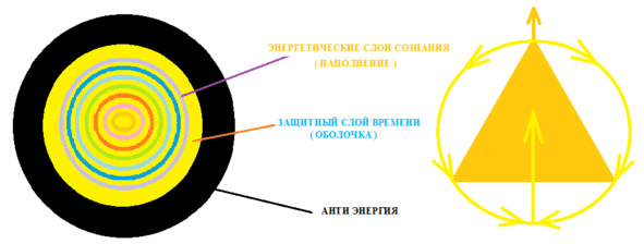 Также материя Времени есть результат реализованного желания Сознания Вселенной и сотворена существом вибраций Сознания, а значит, обладает подобной структурой и свойствами Сознания, но уже отстающий по Времени от Сознания, реализовавшего его. То есть энергия Времени, как энергетическая защитная оболочка, являясь результатом, является существом настоящего продолженного Времени, а Сознание Вселенной (наполнение), реализующее информации-энергии Высшего порядка, пребывает за пределами настоящего Времени – в энергиях Рая вне Времени, но при этом будучи энергетически взаимосвязанным с энергиями настоящего Времени: чувствуя защитный потенциал оболочки и анализируя импульсы, поступающие от нее.