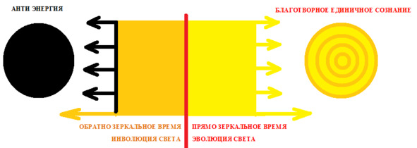 Энергия Времени расслаивается на обратно и прямо зеркальные составляющие. Потенциал обратно зеркальной энергии Времени, блокирующий антиэнергию, то есть устремляющийся к Высшему Истоку с задержкой от энергий прямо зеркального Времени, не проявлен для нашего восприятия, так как на порядок отстает по Времени (по энергетическому состоянию) от настоящей проявленной реальности.