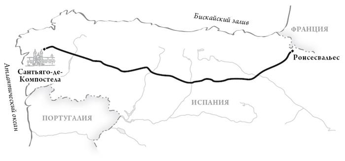 Я пытаюсь делать заметки в своем дневнике, но не могу сосредоточиться. Я достаю карту, раскладываю ее у себя на коленях и ручкой рисую на ней маршрут паломничества. Линия начинается в Ронсесвальесе – в монастыре, который находится недалеко от франко-испанской границы, тянущейся вдоль Пиренеев. Затем она стремится на запад по открытой местности, усеянной маленькими городками, а иногда проходит и через города с такими названиями, как Памплона, Эстелья, Логроньо, Бургос, Леон и, наконец, Сантьяго-де-Компостела. Длина маршрута составляет около 780 километров. Больше пятисот миль. Гораздо длиннее, чем предполагал мой итальянский друг.
