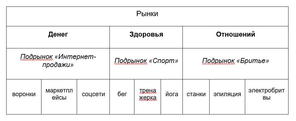 Простой пример. Человек хочет побриться. Зачем? Хочет выглядеть приятно для семьи, коллег, для общества. Ради хороших отношений. То есть на рынке отношений существует подрынок бритья. А на каждом подрынке есть ниша – конкретный способ удовлетворения потребности. Кто-то будет использовать электрическую бритву, кто-то – бритву с лезвием, а кто-то сделает эпиляцию.