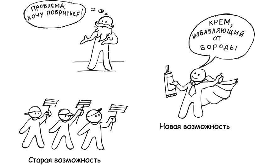 Вернемся к примеру с бритьем. Допустим, вы решили выпустить на рынок электробритву с пятью плавающими головками. Все остальные продают с тремя, вы усовершенствовали идею. В таком случае вы создали обычную новую нишу, где предлагаете клиентам улучшенную возможность решения их проблемы. А если вы изобрели, допустим, крем, который замедляет рост волос, и предлагаете его как альтернативу бритве, то даете людям новую возможность и создаете новую перспективную нишу.