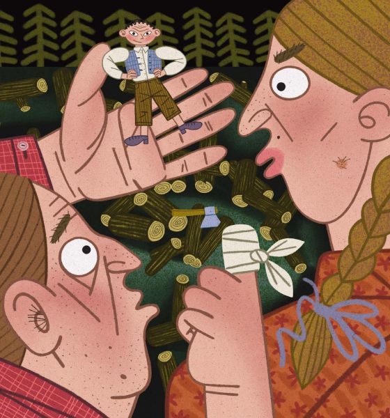 Как-то раз они совместно дрова рубили. Она полено держала, а он топор занес и ХРРРЯЯЯСЬ! Попал ей по пальцу и отрубил палец-то! Как есть отрубил! А она даже не охнула: не впервой ей пальцы-то терять. Думает: «Ладно, к бабке сходим через неделю. Она пришьет». А пока палец в тряпицу сопливую завернула и положила подле, на лавку. Через минуту там что-то завозилось, зашебуршало. Они размотали тряпку, а там мальчик-с-пальчик. Вроде как превратился из пальца.