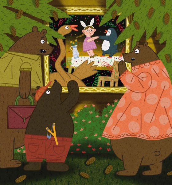 Медведи медленно – в храпиде – пошли в сторону спальни, заглядывают, а там на одной кровати страус лежит, на второй пингвин, а на третьей девочка в респираторе и в обнимку с огнетушителем.