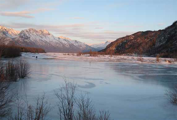 23 февраля перед утренней пробежкой Костя поздравил нас с Днём Советской армии и Военно-морского флота. По этому случаю распили четверть яблочного сока (кстати, это один из немногих американских продуктов, не вызвавший нареканий). Наш ежедневный тренировочный маршрут охватывал периметр порта с выходом на смотровую площадку возле устья реки Матануска. Поскольку уровень воды в заливе за зиму упал метра на два, припай вдоль берега обвалился, образовав непроходимые, смёрзшиеся торосы. Мимо них с шорохом ползли бесконечной лентой льдины. Стало понятно, отчего у причалов нет судов – залив плотно забит этим подвижным мессивом. Открытые окна воды просматривались лишь на выходе из залива Кука, километрах в пяти от порта. Проплывающий лёд довольно грязный. Видимо, из-за городских стоков.