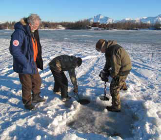 И, пробубнив на ходу ещё что-то, уехал. (К стоявшему с фотоаппаратом Андрею он даже не подошёл.) Василий перевёл: «Рыбачить на Аляске имеет право только тот, кто прожил здесь не меньше года». Нельзя так нельзя. С полчаса мы с азартом наблюдали, как Василий таскал рыбу. Горка на льду быстро росла. Я не устоял, решил проверить, есть ли наживка на моей удочке. Вытянул леску – крючок голый. Насадив новый аппетитный кусочек креветки, бросил обратно. И в тот же миг окрестности сотряс рёв сирены. Обернулись – из леса прямо на нас спрыгнул на лёд, весь в клубах снега, знакомый джип. Он весь в переливистом сиянии красных и синих огней: не машина, а новогодняя ёлка. Подлетев ко мне, джип встал как вкопанный. Дверь распахнулась, и из кабины выскочил взбешённый блюститель порядка.