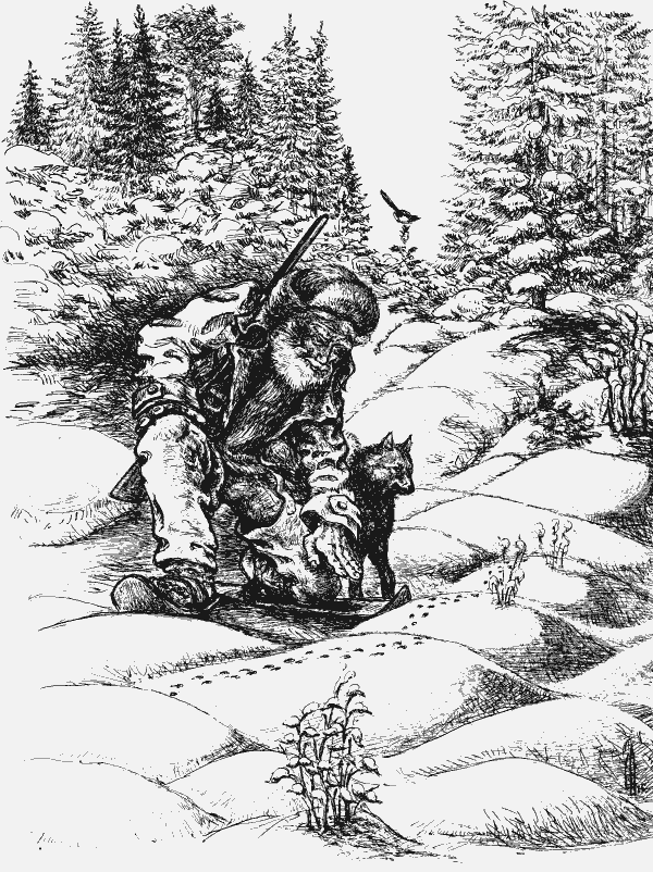 Из-за бокового ветра росомаха слишком поздно уловила тягучую едкость табака. Эта вонь и заставила её поднять голову. Увидев впереди двуногого и оскалившуюся собаку рыжей масти, она нырнула под согнувшиеся от тяжести скопившегося снега еловые лапы.