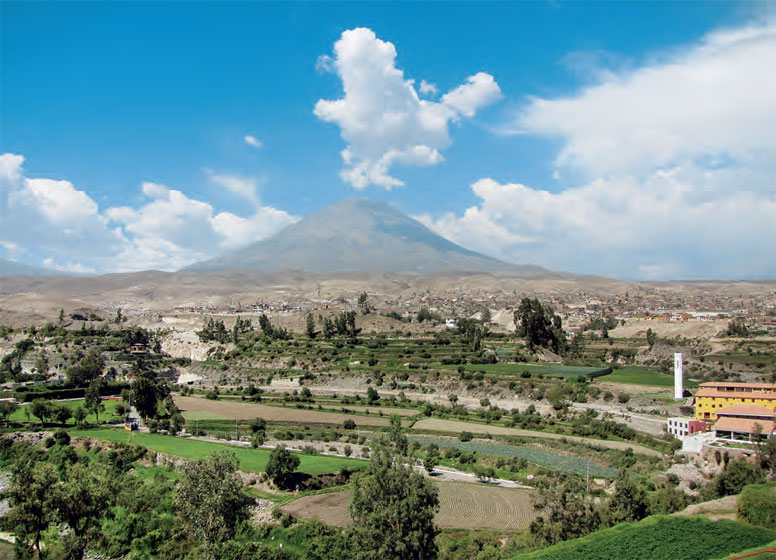 А вон и белые дома, похожие на ступенчатые кубики, появились – город Арекипа. Он окружён высоченными вулканами во главе с неразлучной парочкой – заснувшим Чачани (6075 м) и действующим Мисти (5822 м). Межгорной впадины городу уже не хватает, и новые постройки буквально вгрызаются в склоны вулканов. (Отчаянный народ – а если вулкан рванёт?!)