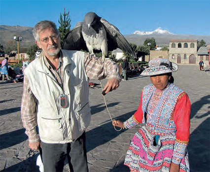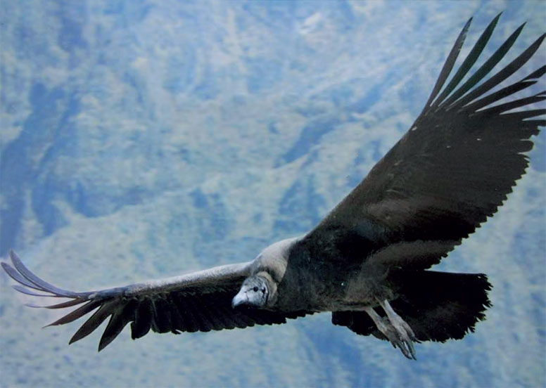 Узкая дорога, вьющаяся над пропастью, привела нас к гигантскому камню, на котором установлен массивный крест (альтиметр в этом месте показал 4000 метров). Взобравшись на макушку этой глыбы, застыли от восхищения. Глубоко-глубоко внизу, в тисках скал, беззвучно пенилась бурная речушка. Над ней на разных уровнях в восходящих потоках парили, нарезая круги, десятки кондоров – американских грифов с размахом крыльев до двух метров. Кто-то в одиночестве, кто-то парами. Те, кому наскучило это занятие, сидели на скалах и с глубокомысленным видом обозревали окрестности.