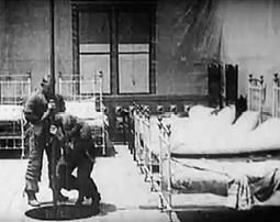 Наконец, картина «Злоключения Мэри Джейн» Смита (1903 г.) – классика черной комедии, которая отличается сложным монтажом – как внутриэпизодным, так и межэпизодным. Сначала мы видим героиню фильма, домохозяйку Мэри Джейн (Лаура Бэйли из «Позволь мне снова помечтать») на общем плане в кухне – она чистит ботинки (средний план лица Мэри Джейн, измазанного ваксой), пытается раздуть огонь в очаге (общий план) и решает использовать керосин (опять средний план, хорошо видна надпись «КЕРОСИН» на бутылке), но происходит взрыв (общий план). Следующая сцена – мы видим общий план крыши дома, Мэри Джейн вылетает в трубу, чуть погодя сверху валятся ее останки. Следующая сцена открывается крупным планом кладбищенского памятника, на котором значится: «Здесь лежит Мэри Джейн, которая разжигала очаг керосином. Мир твоим кусочкам». Общий план, к могиле подходят четыре скорбящие женщины – и в ужасе разбегаются, когда из могилы поднимается дух Мэри Джейн (двойная экспозиция) в поисках бутыли из-под керосина.