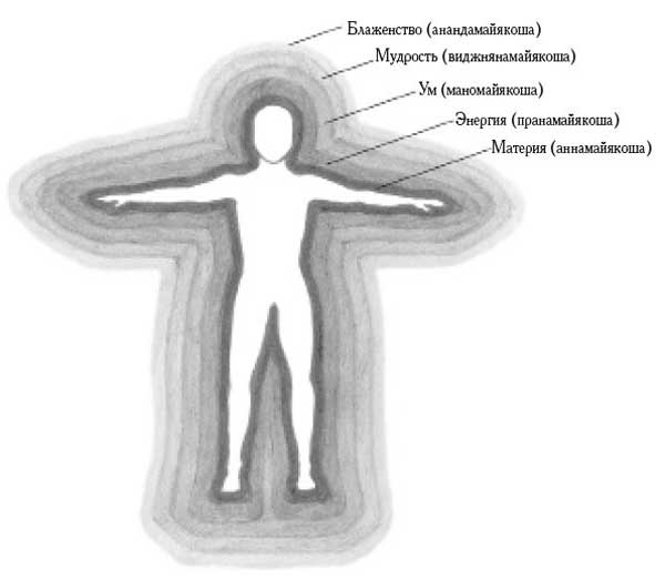 Комплекс «тело-ум» состоит из оболочек-кош. Убеждения, выводы и незавершенный опыт (самскары), хранящиеся в самом тонком из тел, теле блаженства, оказывают влияние на остальные, более плотные коши. Если, к примеру, в теле блаженства отпечатан опыт, снова и снова приводящий нас к выводу о том, что «жизнь – тяжелая штука» или «все против меня», такой вывод будет соответствующим образом фильтровать наше восприятие (тело мудрости), придавать форму мыслям (ментальное тело), направлять наши чувства (энергетическое тело) и даже влиять на наши действия (физическое тело). В совокупности опыт, восприятие, мысли и чувства действительно воздействуют на все аспекты нашей жизни.
