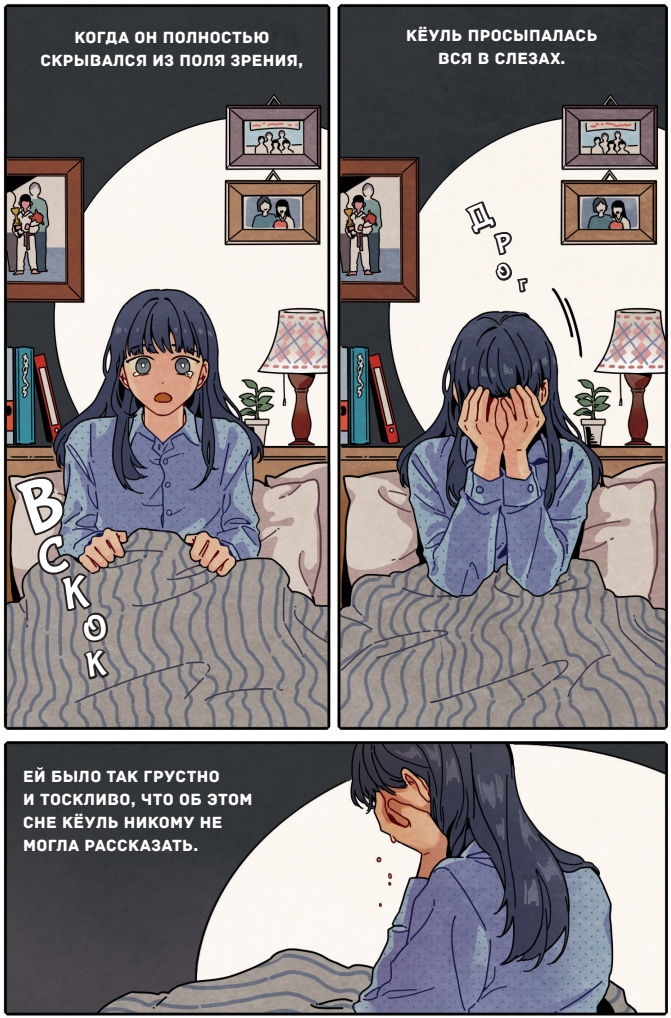 После того как Сынхи и Юри ушли, Кёуль вернулась в дом. После поднявшегося только что шума ей показалось, что там стало тише, чем обычно. Девочка бессильно вернулась в комнату и рухнула на кровать.