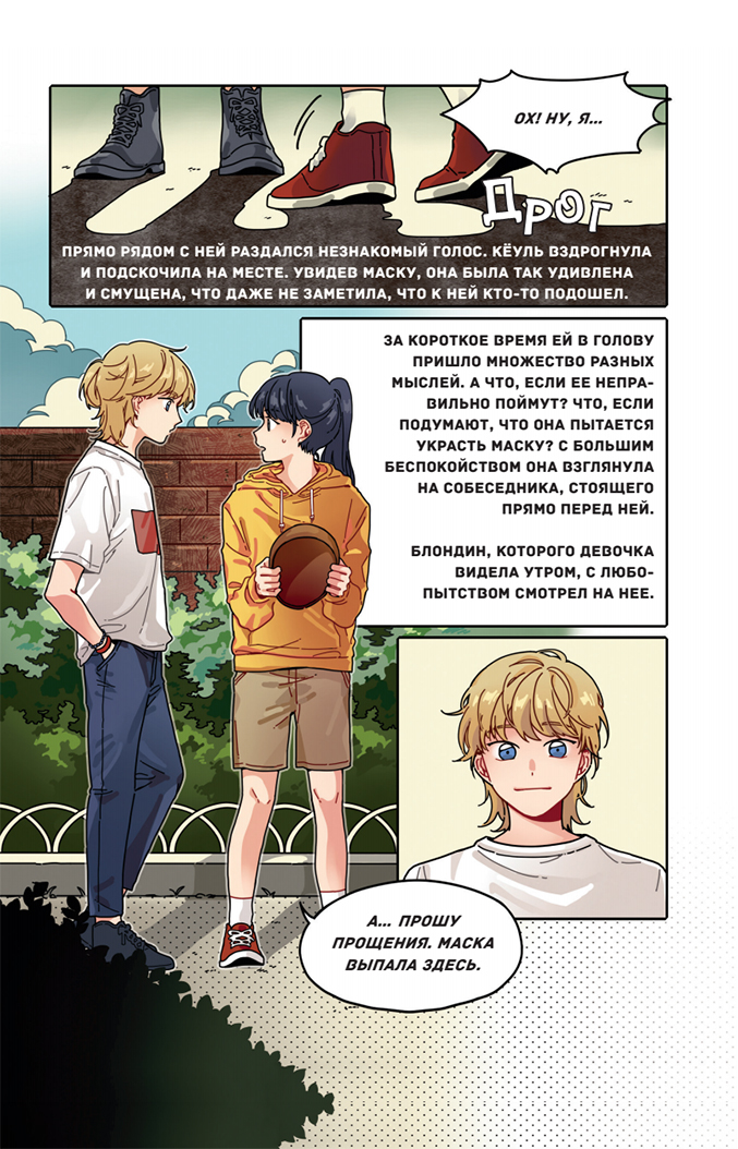 Неужели Кёуль смотрела слишком пристально? Она вдруг случайно встретилась взглядом с повернувшим голову мальчиком. Он слабо улыбнулся и помахал Кёуль, но та быстро отвернулась. Ей было стыдно, что ее заметили, поэтому она опустила взгляд и прошла мимо здания, специально размахивая руками так сильно, как только могла. Лицо Кёуль покраснело до самых ушей.