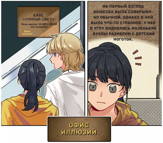 Они были настолько маленькими, что на первый взгляд могли показаться просто каракулями. Но для того, чтобы их таковыми считать, они были выгравированы слишком тщательно. В отличие от других надписей на табличке, которые были просто нанесены черной краской, эти буквы имели рельеф и позолоченную поверхность. Маленькая надпись «Офис иллюзий» в углу казалась даже более значимой, чем название кафе «Лунный свет», написанное большими буквами в центре. хотя кеуль это и показалось странным, она не стала слишком глубоко об этом задумываться. Когда Юрий открыл дверь, обстановка отозвалась чистым радостным звуком.