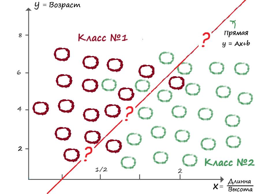 Получив задание, классифицировать два вида животных, по параметрам, определяющим размеры их тела, с некоторой выборкой данных (значений и ответов), мы смогли запрограммировать искусственный нейрон, основываясь на элементарных знаниях математики, а именно линейной функции, проходящей через начало координат (y = Ax). Определив, что, данные лежащие выше прямой относились бы к одному классу, а все точки данных лежащих ниже – к другим. Тем самым мы лишили бы себя утомительной работы по самостоятельному анализу полученных данных, для классификации их на два вида. Говоря иными словами, мы доверили этот процесс искусственному нейрону, который мы создали на основе знания линейного классификатора. Теперь нейрон самостоятельно классифицирует все данные поступившие на его единственный вход. Более того, после процесса обучения, с обученным коэффициентом (А), мы легко можем задать условие, которое по вводимым пользователем значениям, определяло, к какому виду они принадлежат.