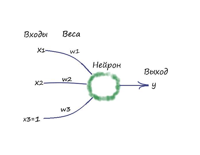 Раз мы решили добавить еще один вход на наш нейрон, то как будет выглядеть функция выхода? Ну первое что приходит в голову, раз мы в первом случае суммировали, по аналогии с линейной функцией, два произведения входных данных и весовых коэффициентов (y = w1x1 + w2), то почему бы не попробовать действовать подобным образом. Тогда представим линейный классификатор функцией – y = w1x1 + w2x2 + w3. Ну и конечно же, эволюционируем наш нейрон, добавив еще одну “ногу” на вход: