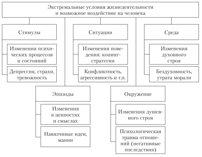 Виды экстремальных состояний многообразны: от банального стресса (физиологический уровень) до глубокой психической травмы (психофизиологический уровень). Или, например, внутренние конфликты, фрустрация, депривация – когда мир вокруг нас перестаёт давать то, что нужно для выживания (психологический уровень). И, наконец, кризисы, которые затрагивают наши отношения с окружающими и обществом в целом (социально-психологический уровень).