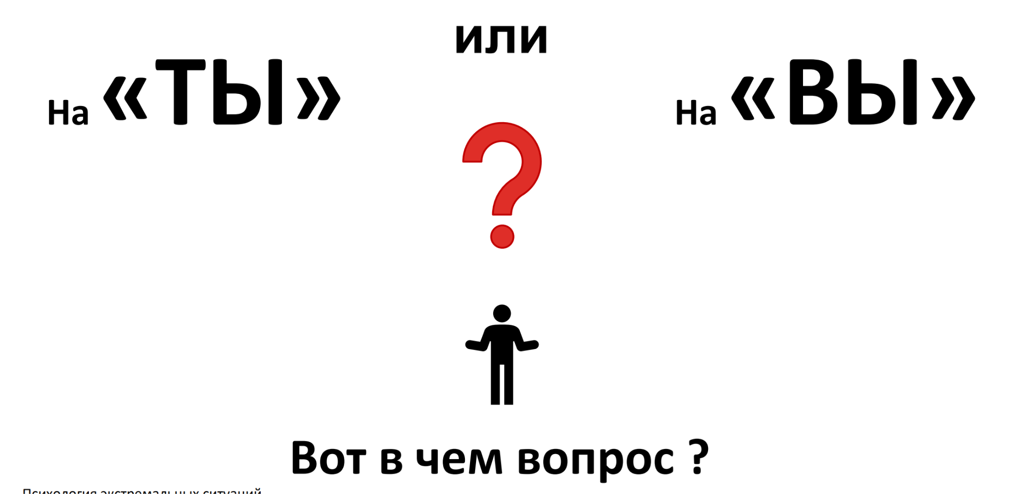 Вы подходите к незнакомому человеку, который только что стал свидетелем ужасного события. Он в шоке, его глаза полны ужаса. Как вы к нему обратитесь? Культурные особенности играют здесь огромную роль. В некоторых культурах обращение на "ты" к незнакомому взрослому человеку может быть воспринято как фамильярность или даже неуважение. В других, наоборот, "вы" может создать излишнюю дистанцию в момент, когда так необходима близость.