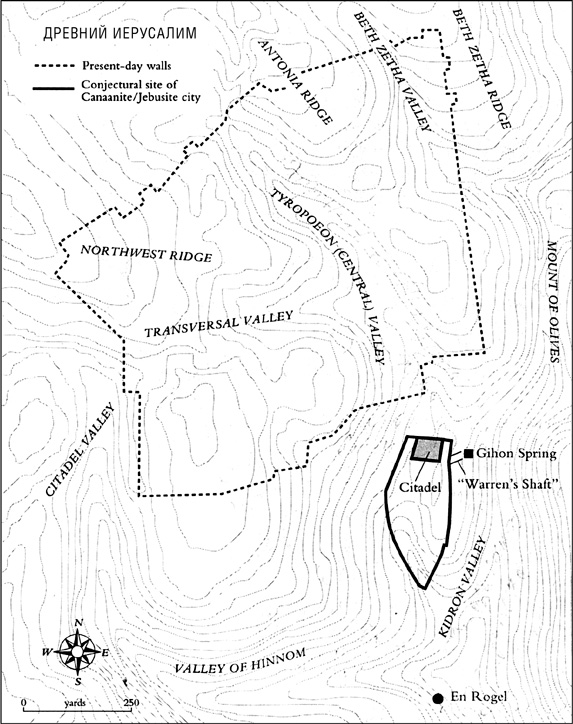 Мы ничего не знаем о людях, первыми поселившихся на холмах и в долинах, где позже раскинулся город Иерусалим. В захоронениях на горе Офель к югу от нынешних стен Старого Города были найдены глиняные сосуды, которые датируются 3200 г. до н. э. Как раз в это время в других частях Ханаана, т. е. на территории современного Израиля, стали зарождаться города; так, на холме Мегиддо, в Иерихоне, Бейт-Шеане, на месте библейских Гая и Лахиша археологи раскопали остатки древних храмов, жилых домов, ремесленных мастерских, улиц и водоводов. Но в Иерусалиме до сих пор не обнаружено никаких свидетельств, позволяющих заключить, что и там в этот период уже началась городская жизнь. По иронии Провидения, этот город, почитаемый миллионами евреев, христиан и мусульман как центр мира, лежал в стороне от торных дорог древнего Ханаана. Расположенный в трудной для освоения гористой местности, он в те поры оказался на задворках. В эпоху ранней бронзы развитие оседлых поселений в основном тяготело к прибрежной низменности, плодородной Изреельской долине и плоскогорью Негев, где египтяне основали фактории. Ханаан обладал немалыми природными богатствами, сулившими процветание: его жители продавали в соседние страны вино, оливковое масло, мед, природный битум и зерно. Он был также важен со стратегической точки зрения, как связующее звено между Азией и Африкой и культурный мост между цивилизациями Египта, Сирии, Финикии и Месопотамии. Но даже при том, что многочисленные родники, окружавшие Офель, издревле привлекали охотников, земледельцев и временных поселенцев – археологи находили здесь глиняные черепки и кремневые орудия труда еще эпохи палеолита, – Иерусалим, насколько известно сегодня, не играл сколько-нибудь существенной роли в этом раннем расцвете.