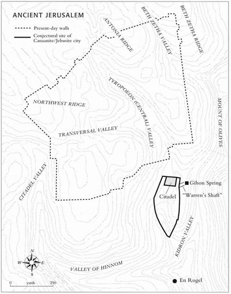 This is the point when Jerusalem can be said to have entered history. In 1961 the British archaeologist Kathleen Kenyon discovered a wall, nearly six and a half feet thick, running along the eastern slope of the Ophel hill with a large gate near the Gihon Spring. She concluded that this town wall continued around the southern end of the hill and along the western slope. In the north it disappeared under a later city wall. Kenyon also found pottery between the wall and the rock scarp which dated to about 1800 BCE. The city was most vulnerable in the north, and later the citadel of Zion was built there; it is possible that there was also a fortress in the north of the city during the eighteenth century BCE. The walls were built quite low down the eastern slope of the Ophel, possibly to include access to an underground tunnel to the Gihon Spring.1 The British engineer Charles Warren had discovered this tunnel in 1867: it started at an opening in the rock within the city, descended obliquely, and then plunged vertically to meet the water which had been conveyed from the Gihon by means of another horizontal tunnel. Jugs and pitchers could be lowered down the shaft during a siege. Similar devices have been discovered at Megiddo, Gezer, and Gibeon. Kenyon believed that the shaft was in use during the Bronze Age, but her theory has been disputed: some doubt that the inhabitants would have had the technological skill to build such a system at this stage. But recent geological findings indicate that “Warren’s Shaft,” as it is known, is not entirely man-made; it is a natural sinkhole along a joint in the limestone, which the ancient Jerusalemites could well have modified and enlarged.2