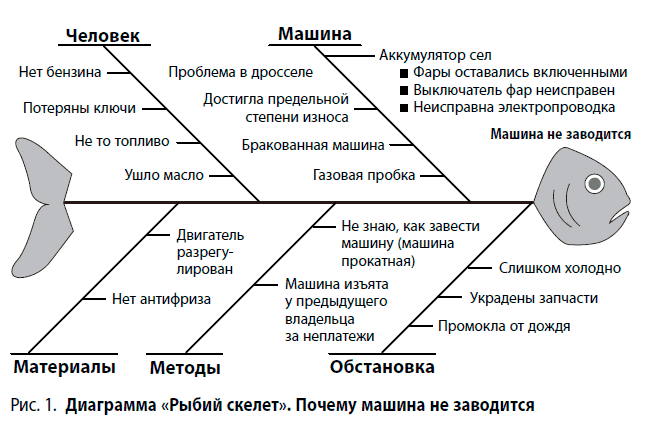 Много лет назад я учила других консультантов пользоваться инструментами решения проблем. На рисунке 1 – один из таких инструментов, входящий в пакет шести сигм, диаграмма Исикавы, она же «елка», она же «рыбий скелет», использующаяся для анализа корневых причин неисправности.