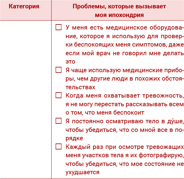Давайте сделаем первый шаг навстречу смене фокуса, оценив степень негативного влияния ипохондрии на вашу жизнь. Когда тревожность снова к вам вернется, записи о предварительной оценке помогут вспомнить, почему вы хотите изменить курс своих мыслей и линию поведения. Это подготовит почву для долгосрочного успеха в преодолении беспокойства о болезни.