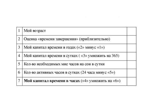 Для начала определим капитал вашего времени, для этого заполните данные в представленной таблице.