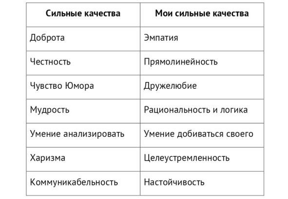 1. Возьмите лист бумаги, разделите на два столбика. В первый столбик выпишите все сильные качества людей, которые вы знаете, что существуют. Во второй те, которые есть у вас, возможно по вашему субъективному мнению.
