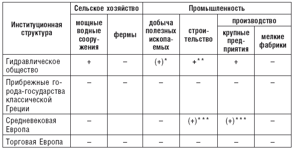 За исключением добычи полезных ископаемых, промышленные производства восточного и западного абсолютных режимов сильно отличались друг от друга, а в феодальной Европе имелось даже определенное сходство между гидравлическим и феодальным обществом. В гидравлической стране большая часть немногочисленных крупных промышленных предприятий находилась под управлением государства. На Востоке же они в основном принадлежали частным владельцам, а государство осуществляло над ними контроль, проявлявшийся в разных видах. В прибрежных городах-государствах Греции правительство не имело никакого желания заниматься промышленным производством, да и знаний и способностей для этого у него не было. Правители средневековой Европы, столкнувшись с иной ситуацией, вели себя по-другому. В своих поместьях они держали мастерские, в которых работали крепостные мастера, удовлетворявшие потребности своих хозяев. Феодалы также заставляли своих крепостных участвовать в строительстве «больших домов» или замков. Сходство между манориальной системой кооперативного труда и гидравлическими работами очевидно. Но функциональное сходство ограничивалось различиями в социальном положении. Средневековые короли и бароны могли использовать лишь труд своих крепостных, а гидравлические лидеры сгоняли на крупные работы как неопытных, так и умелых работников с больших территорий, а иногда – и со всей страны.