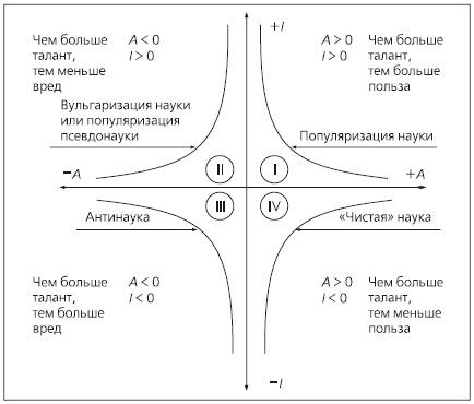 В той его четверти, что относится к популяризации науки в наиболее близком нам первом квадранте, как мы установили, чем больше значение постоянной С, тем большая Понятность может быть достигнута при той же Точности, и наоборот, при той же Точности становится доступной большая Понятность. Коэффициент С – это коэффициент профессионализма, мера таланта и умения научного журналиста. Поэтому можно сказать, что в первом квадранте, для нас наиважнейшем, действует принцип: «Чем больше талант, тем больше польза». Имеется в виду, разумеется, польза для общества в целом.