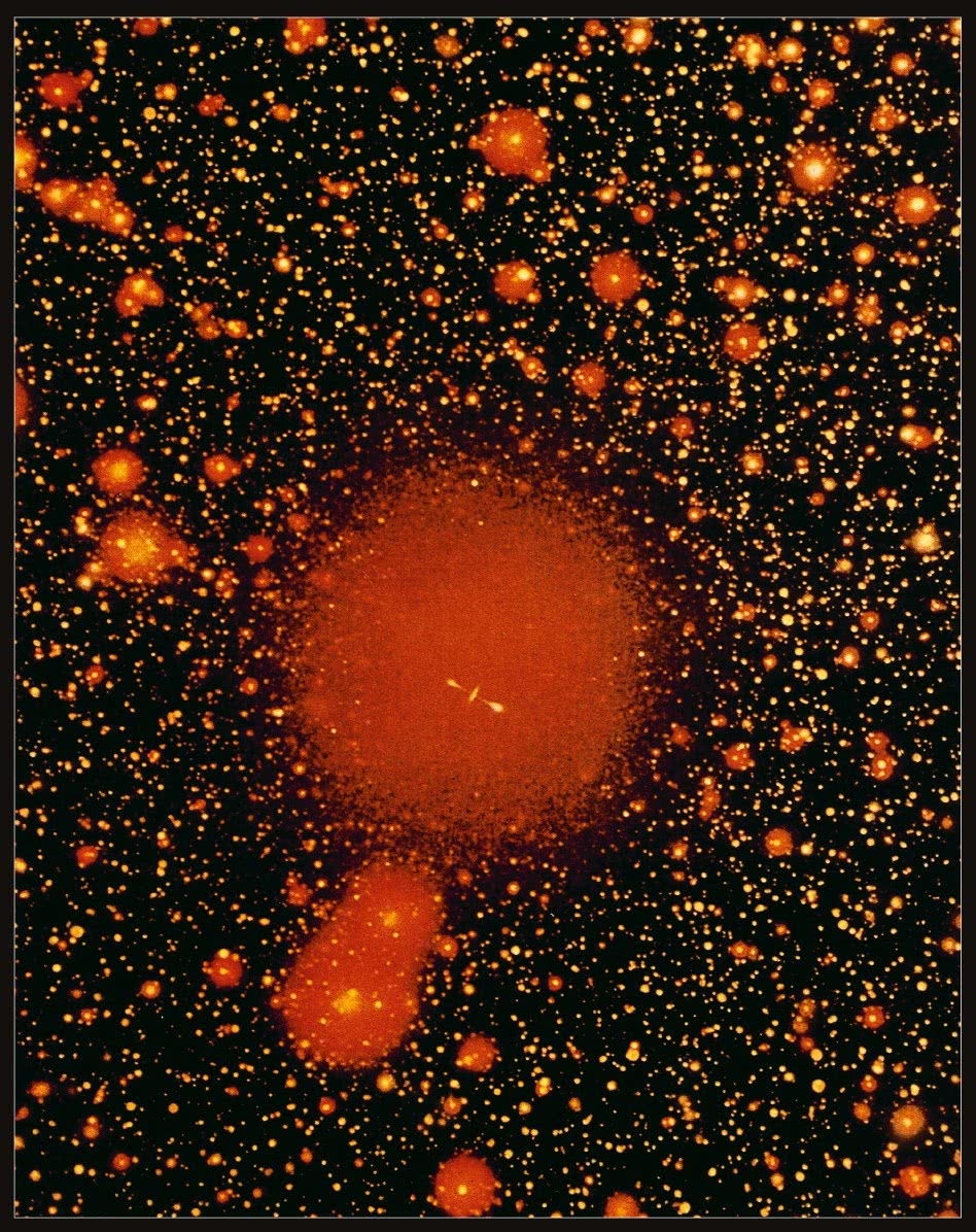 Квазар, находящийся внутри гигантской эллиптической галактики, которая доминирует среди других в богатом скоплении галактик.
