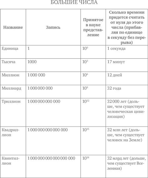 Первые шесть больших чисел, имеющих названия, приводятся далее во врезке. Каждое число в 1000 раз больше предыдущего. Названия чисел больше триллиона практически не употребляются. Если считать круглые сутки без остановки, прибавляя по единице в секунду, потребуется больше недели, чтобы досчитать до миллиона. На миллиард у вас уйдет полжизни. До квинтиллиона вы не доберетесь, даже если проживете столько, сколько существует Вселенная.