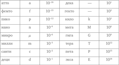 Помимо принятого в науке экспоненциального представления каждое число можно выразить и словами с помощью приставок. Например, электрон имеет один фемтометр (10–15 м) в поперечнике, длина волны желтого света – полмикрометра (0,5 мкм), глаз человека способен различить насекомое размером в одну десятую миллиметра (10–4 м), радиус Земли 6300 км (6,3 мегаметра), вес средней горы 100 петаграмм (1017 г). Вот все возможные приставки и их значения: