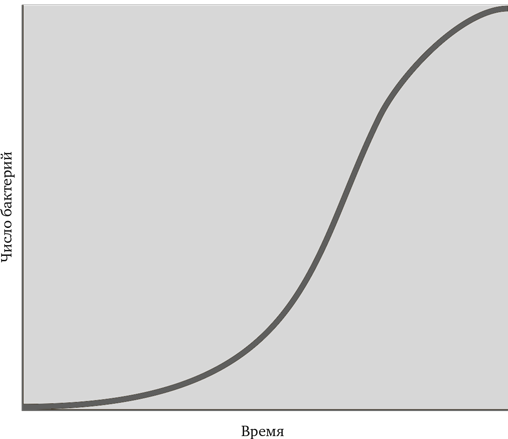 Многократное удвоение и, следовательно, экспоненциальный рост – характерная особенность воспроизводства биологических организмов. Начнем с простого примера – бактерии, размножающейся делением. Через положенное время каждая из двух дочерних бактерий также делится надвое. При достаточном количестве пищи и отсутствии ядов в среде обитания колония бактерий растет в геометрической прогрессии. В самых благоприятных условиях удвоение их численности происходит примерно каждые 15 минут: четыре удвоения в час, 96 в сутки. Одна бактерия весит около одной триллионной доли грамма, но всего через сутки безудержного размножения ее потомки сравняются весом с горой, через каких-нибудь полтора дня – с Землей, а через двое суток перетянут на весах Солнце… Пройдет еще немного времени, и вся Вселенная будет заполнена бактериями. Перспективы не слишком радужные, но, к счастью, несбыточные. Почему? Потому что подобный экспоненциальный рост неизбежно упирается в тот или иной естественный барьер. Букашки, например, съедают всю пищу, отравляют друг друга или перестают спариваться, когда их слишком много. Экспоненциальный рост не может продолжаться вечно, иначе он поглотил бы все, но задолго до этого в игру вступает сдерживающий фактор. Экспоненциальная кривая выходит на плато (см. рисунок).
