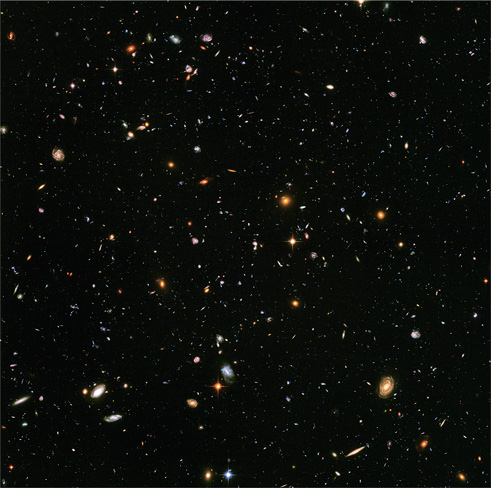 В 2004 г. космический телескоп «Хаббл» в течение 11 дней снимал небольшой участок звездного неба (по размерам равный одной десятой полной Луны), в результате чего было получено это изображение приблизительно 10 000 галактик. Свет от самых дальних из них шел до объектива «Хаббла» почти 13 млрд лет. Каждая галактика содержит множество миллиардов звезд, а каждая звезда может оказаться центром звездной системы из десятка планет.
