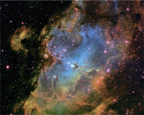 Звездная колыбель, удаленная от нас примерно на 6500 световых лет. Сквозь брешь в темной оболочке космической пыли мы видим скопление сияющих новорожденных звезд. В их насыщенном голубом свете, наполняющем полость в облаке размером около 20 световых лет в поперечнике, рисуются волокна и столпы из газа и пыли.