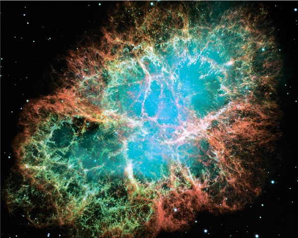 Это остатки той же взорвавшейся звезды, сверхновой, которую наблюдали китайские астрономы и индейцы анасази в созвездии Телец в 1054 г. Они зафиксировали внезапное появление яркой новой звезды, которая затем медленно померкла и пропала из вида. Волокна – это разворачивающиеся в пространстве продукты взрыва, обогащенные образовавшимися при взрыве тяжелыми химическими элементами.