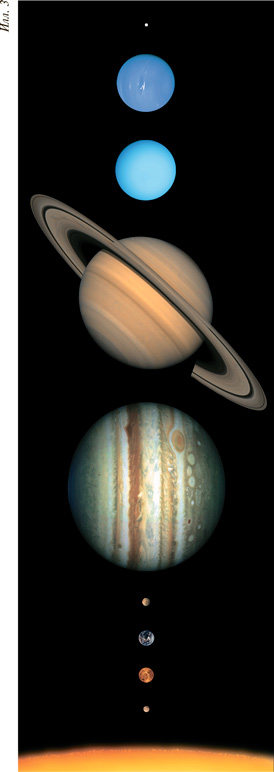 Слева направо, по порядку и с соблюдением относительных размеров: Солнце, четыре планеты земной группы (Меркурий, Венера, Земля, Марс), четыре газовых гиганта (Юпитер, Сатурн, Уран, Нептун) и Плутон.