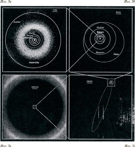 Далее перед нами четыре современные попытки изобразить то же самое. На рис. 5а – Земля и остальные внутренние планеты на своих орбитах. Каждая из крошечных белых точек – мельчайшая частица облака небесных тел под названием астероиды. За ними проходит орбита Юпитера. На отрезке шкалы вверху представлено расстояние от Земли до Солнца, называемое астрономической единицей (а. е.). Это наш первый пример – дальше их будет еще много – высокомерного гео- и антропоцентризма, которым, похоже, заражены все попытки человека взглянуть на космос. Брать за единицу измерения Вселенной расстояние от Земли до Солнца – чисто человеческая условность. Но поскольку в астрономии это уже давно устоявшаяся единица, я буду использовать ее и в дальнейшем.