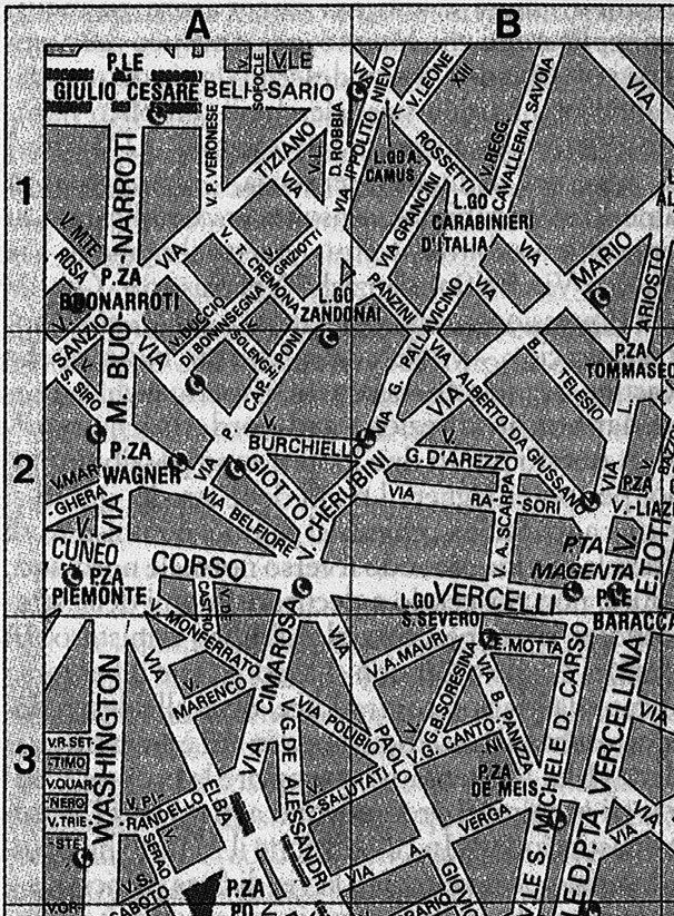 Фрагмент карты, с указанием улицы Керубини, где было совершено убийство, – из миланского алфавитного указателя улиц и телефонов. Именно с его помощью Марино на своем первом допросе описал заместителю прокурора Помаричи путь, по которому обвиняемые якобы скрылись с места преступления и который прямо противоречил маршруту, установленному во время следствия. Ни заместитель прокурора, ни следственный судья не обнаружили противоречия; наоборот, в итоговой обвинительной речи подчеркивалась точность в описании бегства, сделанном Марино. Материалы следствия были опубликованы, и грубая оплошность оказалась на виду. Тогда судебные чиновники стали утверждать, что ошибка объясняется тем, что карту положили перед Марино «вверх ногами».