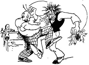 От слов недолго и до дела. Старики вцепились друг другу в парики и начали тузить друг друга. Наконец, парик Рыжика очутился в руках Антона, а Антонов парик в зубах у Рыжика.