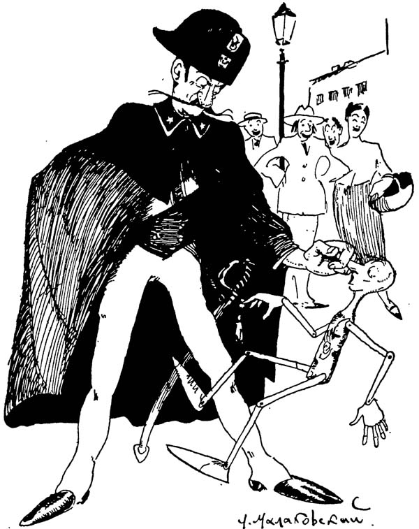 Прохожие, видя бегущего Петрушку, только хохотали от восторга. К счастью, на углу улицы стоял городовой. Заслышав крик и хохот, городовой подумал, что, должно быть, у кого-нибудь убежал из конюшни жеребенок, и решил его поймать во что бы то ни стало.