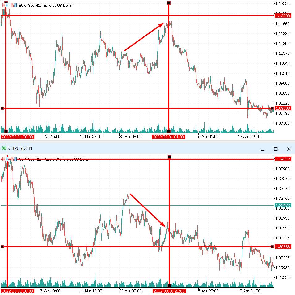 Пример (2022 год): В марте 2022 года ФРС намекнула на повышение процентных ставок, что укрепило доллар. В результате EUR/USD упал с 1.12 до 1.08 за одну неделю, а GBP/USD – с 1.34 до 1.30. Коэффициент корреляции за этот период составил ( r = 0.92 ), подтверждая сильную положительную связь. Однако в конце марта GBP/USD временно отстал, упав после коррекции до 1.31, в то время как EUR/USD стабилизировался на 1.11 из-за новостей о торговых переговорах ЕС.