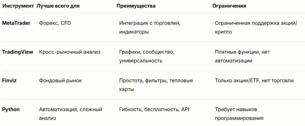 Рекомендация: Используйте MetaTrader для форекс и быстрого анализа, TradingView для визуализации и кросс-рыночных корреляций, Finviz для акций, а Python для автоматизации и глубокого анализа. Комбинируйте инструменты для максимальной эффективности.