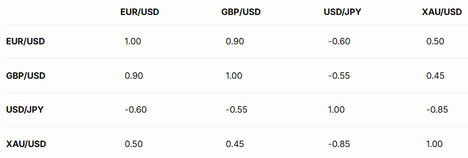 Корреляционная матрица – это квадратная таблица, в которой строки и столбцы соответствуют активам, а значения в ячейках – коэффициентам корреляции Пирсона ( r ), варьирующимся от -1 до +1. Диагональные элементы матрицы всегда равны 1, так как актив полностью коррелирует сам с собой. Например, матрица для активов EUR/USD, GBP/USD, USD/JPY и золота (XAU/USD) выглядит так: