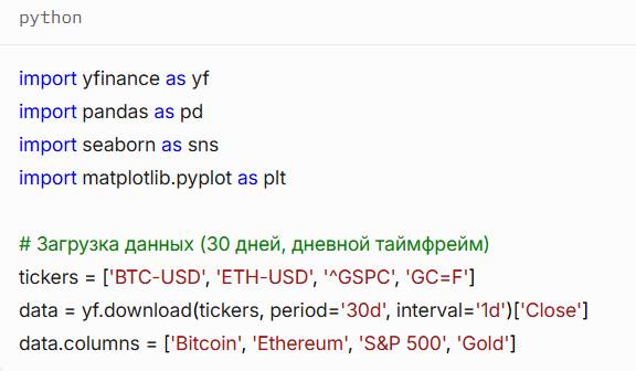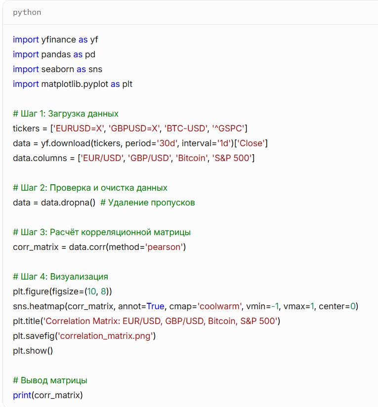 Python – наиболее гибкий инструмент для построения корреляционных матриц, особенно для кросс-рыночного анализа. Рассмотрим пошаговый процесс с кодом для активов EUR/USD, GBP/USD, Bitcoin и S&P 500.