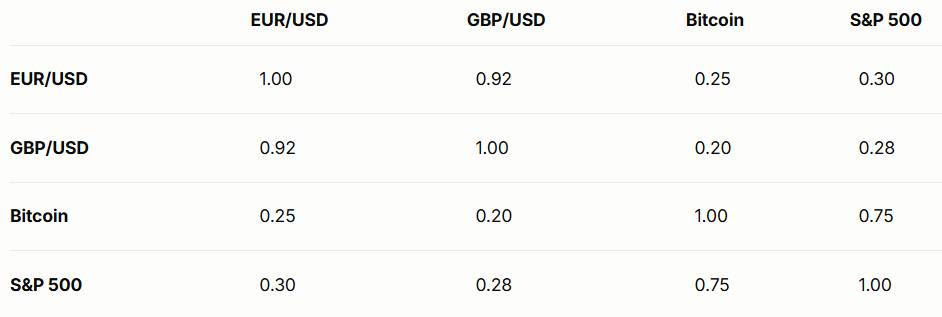 EUR/USD и Bitcoin: ( r = 0.25 ) – низкая корреляция, полезная для диверсификации.