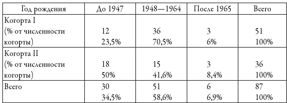 Мы попытались обнаружить здесь некоторый поколенческий эффект49 или некую неизменную сердцевину движения, сложившуюся на основе общности опыта и жизненных ситуаций участников50. Возрастная структура выборки изученных нами неформальных лидеров действительно демонстрирует, что поколенческое ядро составляют родившиеся с 1948 по 1964 год; их особенно много в первой когорте (см. таблицу 1).