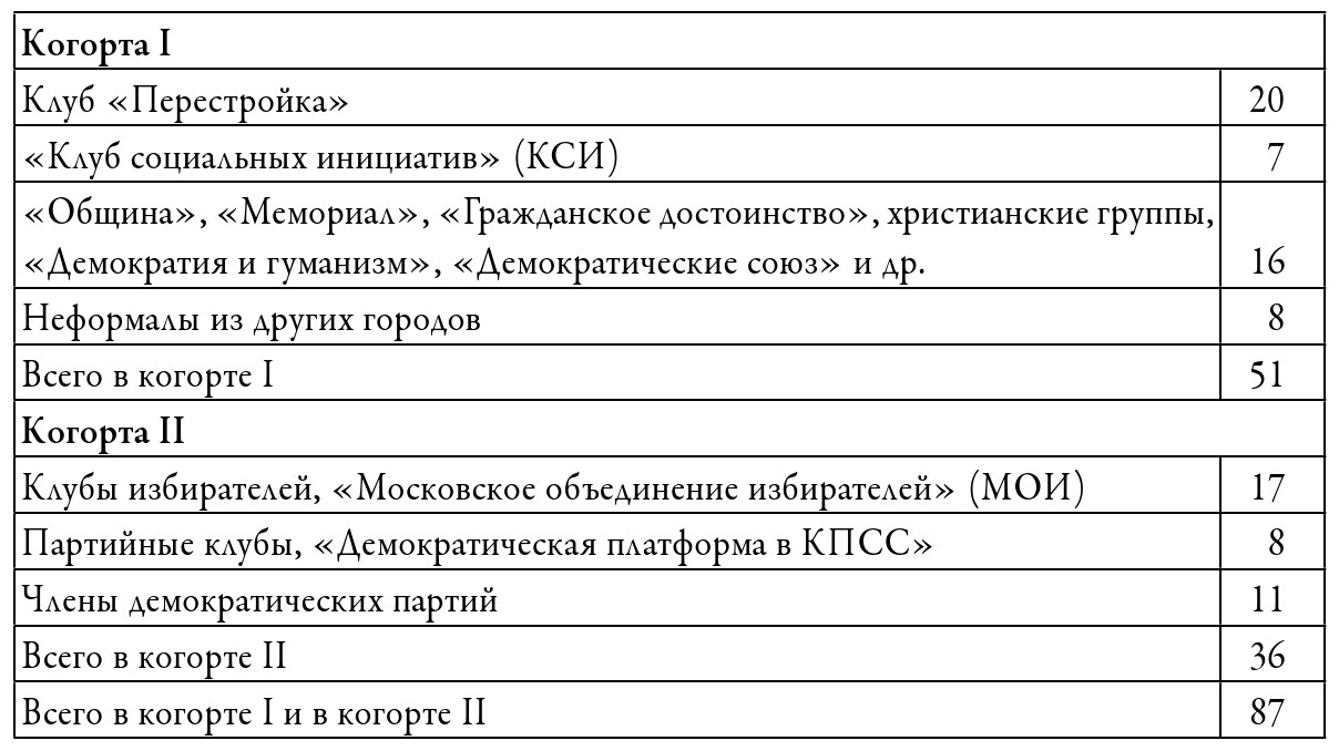 Мы включали в анализ некоторых неформалов из других городов – в том случае, если они сыграли важную роль в московском демократическом движении 1989—1990 годов (как, например, в случае с ленинградскими депутатами). И наконец, мы не включили в выборку «партаппаратчиков» и представителей академического истеблишмента (Б. Ельцина, Ю. Афанасьева, Г. Попова, А. Собчака, А. Сахарова), с которыми вступали в сговор «рядовые» неформалы и демократы.